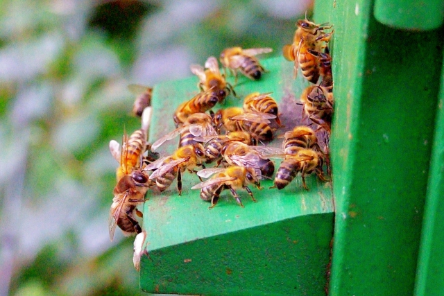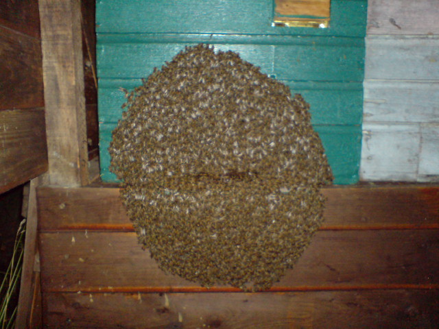 Eine Bienentraube vor dem Flugloch eines Blätterstock